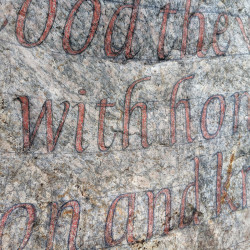 Hart creates beautiful bespoke memorials and plaques for private clients, businesses, educational institutions and ecclesiastical buildings. Each work is designed to suit his client’s individual needs, and he offers guidance through the whole process from stone selection to installation. His work, which can include a mix of lettering and relief sculpture, is carefully drawn by hand with a focus on strong letter design and composition. His designs are then carved by hand with hammer and chisel.